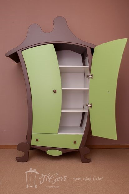 A ruhásszekrény mókás formája szinte életre kelti a gyerekbútort. Talán egy elvarázsolt kastélyból szökött meg és szaladt egészen a gyerekszobáig.