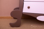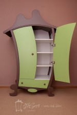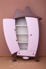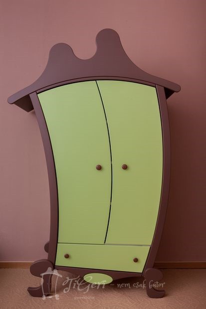 Ruhásszekrény egy igazán mesebeli megjelenésű bútor, egyenes vonalat szinte alig találni rajta. Minden szeglete jól kihasználható, a forma nem megy a praktikum rovására. Két nagy ajtó mögött belső elrendezése polcos, alsó részen fiókkal. Blum (osztrák csúcsminőségű) pántokkal és fióksínnel szerelve, fogantyúi fémből készültek szinterezve.